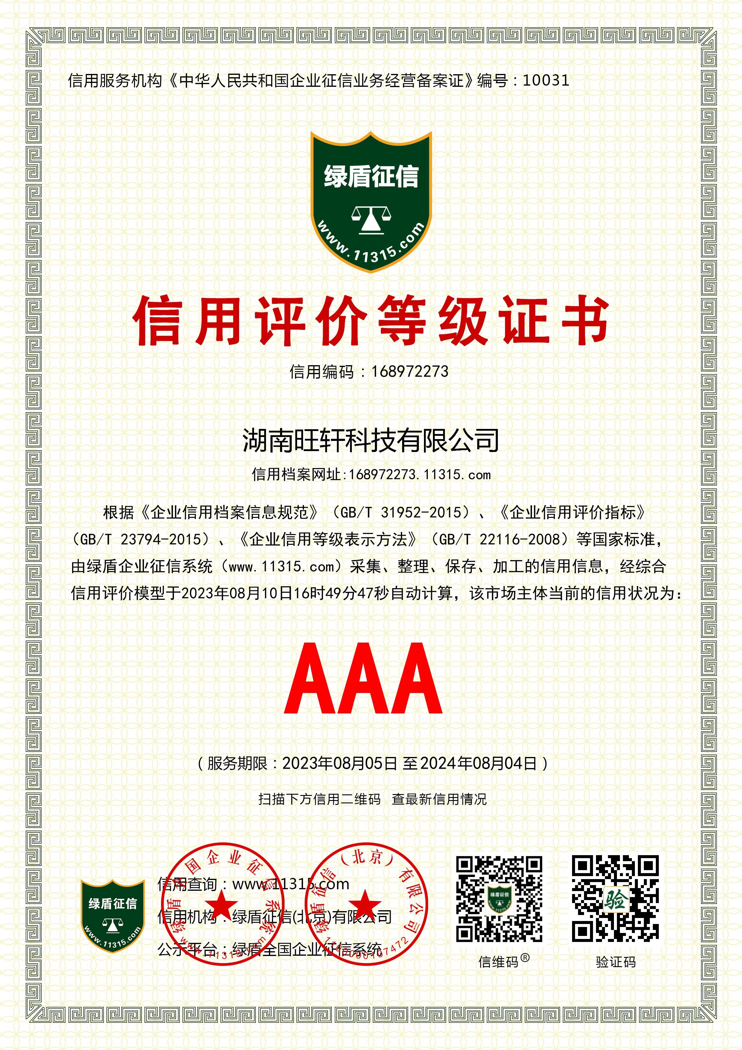 AAA信用等級證書